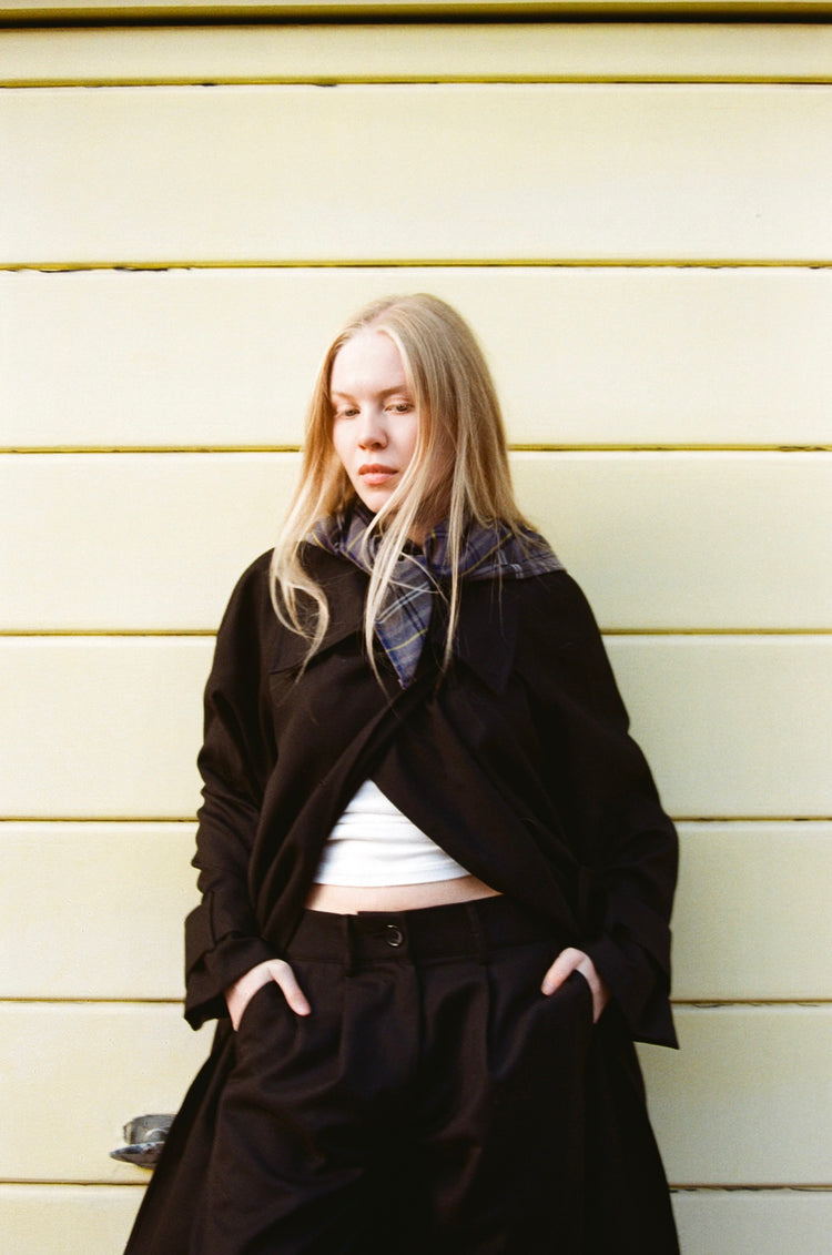 A modern twist on a classic silhouette, this double-breasted coat is crafted from a premium wool blend, offering durability, warmth, and an elegant drape. The design features a dropped waistband with an adjustable drawstring, allowing for a versatile fit and a subtle play on proportions. Finished with polished metal buttons, the coat balances timeless tailoring with contemporary detailing. Perfectly suited for both formal and casual settings, it can be paired with the matching Maude Trouser set for a complete and refined look.